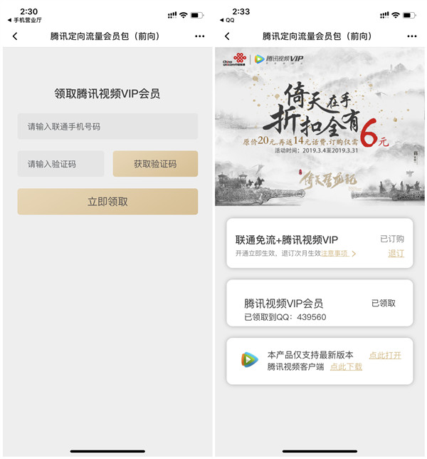 这个活动原价是20元的 现在可以6元订购联通腾讯视频免流+1个月腾讯视频会员