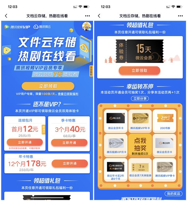 腾讯视频VIP用户免费领取7天微云会员,每天数量有限,只有100张!在活动页面开通腾讯视频会员可以领取15天微云会员