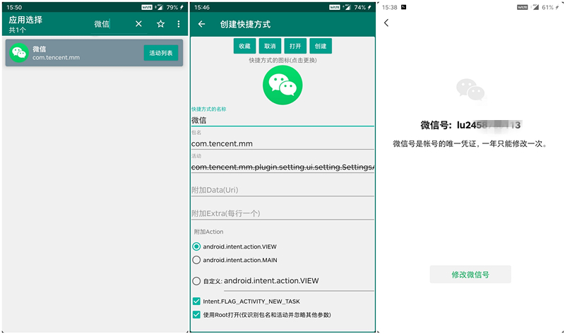 “com.tencent.mm.plugin.setting.ui.setting.SettingsAliasUI”,点详情,再点打开(需要授予ROOT权限)